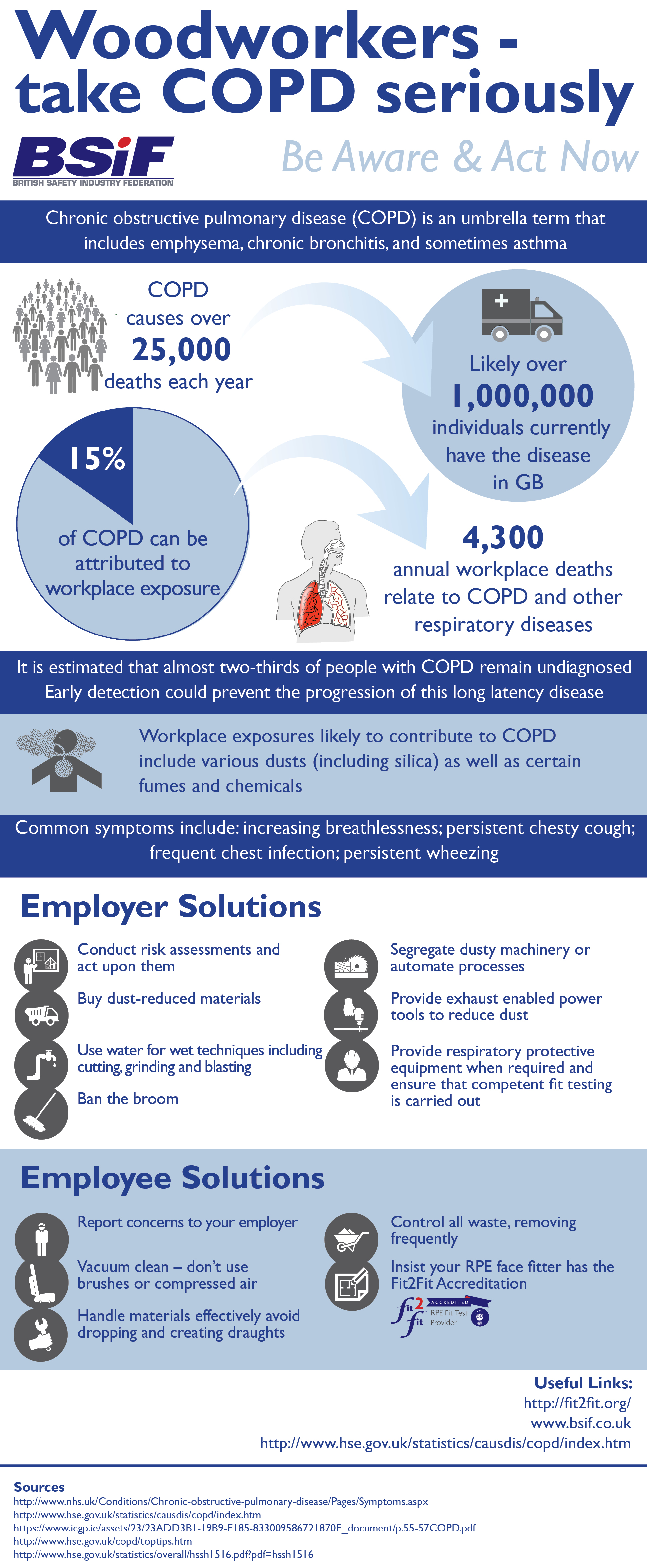 The BSIF is committed to raising awareness with both workers and employers on the risks of dust exposure and the control measures required that could reduce long term-ill health. The infographic below, illustrates the issue of COPD and outlines the changes both workers and employers could make in the workplace in order to reduce the risk of developing this life limiting disease.: