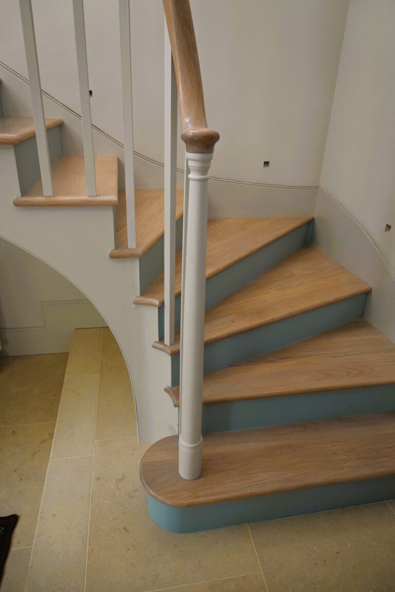 The most technically demanding element was the cut-string staircase. Structural challenges meant fitting steel supports above the entrance before work could even begin. Precision was crucial – the curved design required individually calculated balustrade spacing to meet modern regulations while following the natural arc of the staircase. The crowning touch was a continuous curved oak handrail – now a favourite feature of the homeowners and a talking point among guests.